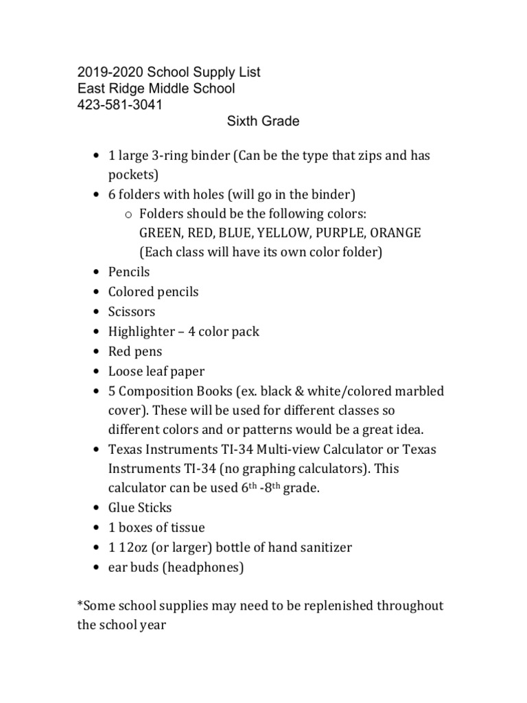 About Press Copyright Contact us Creators Advertise Developers Terms Privacy Policy & Safety How works Test new features Press Copyright Contact us CreatorsBelow is a 2122 list of basic supply items Individual teachers may have additional supply needs Please do not worry if your child does not have all of his/her supplies on the first day 6th GRADE SUPPLY LIST · Pencil pouch with pencils, pens, glue sticks, colored pencils, highlighters, and expo markers · TI34 calculatorJul 31, · 6th Grade Suggested School Supply List I Suggested Perishable Supplies 3 each Highlighters, different colors 1 package Colored Pencils (8count) 2 packages #2 Pencils (12count) 2 packages Colored Pens (8count) 2 packages Notebook Paper (100count, looseleaf wideruled) 1 pair Scissors 4 each Glue Sticks